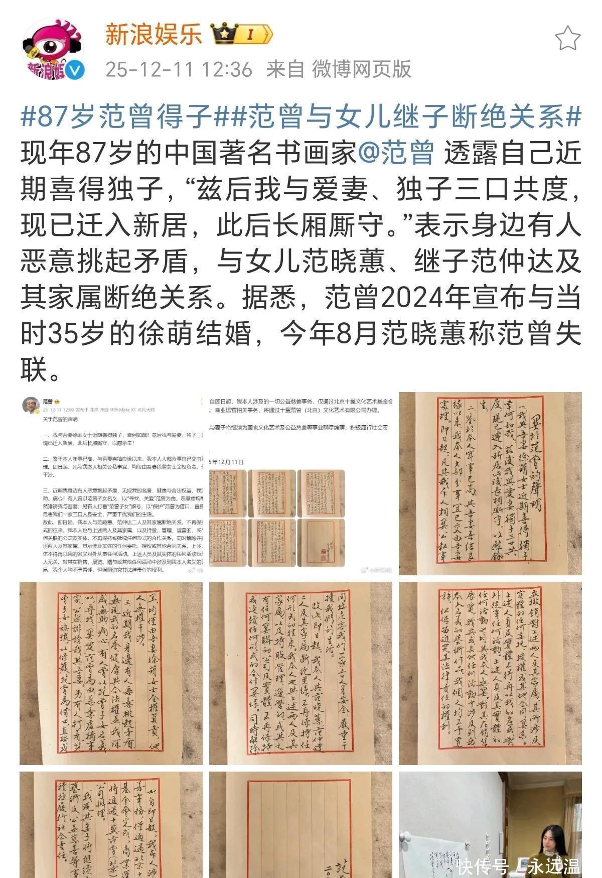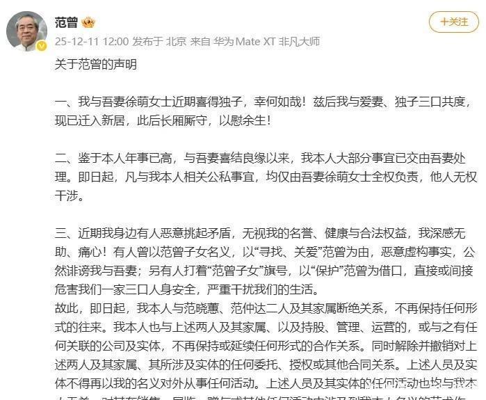 范曾在12月11日的声明里说,有人故意搅和家里的事,丝毫不顾及他的身体,这话让他凉透了心。核心矛盾还是钱——去年他和徐萌领证,儿女们就极力反对,今年这出“寻人”戏码,彻底耗尽了他的耐心。所以他干脆表态,和范晓蕙、儿子范仲达断绝关系,名下所有财产都交给徐萌打理。