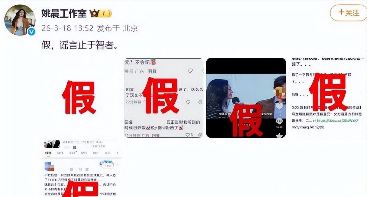 几乎在同一时段,姚晨工作室迅速响应,以一句斩钉截铁的“假,谣言止于智者”完成精准回击。声明中更附上多张典型谣言截图,每一张均清晰标注红色“假”字水印,形成闭环式证据链,彻底封堵不实信息的任何辩解出口。