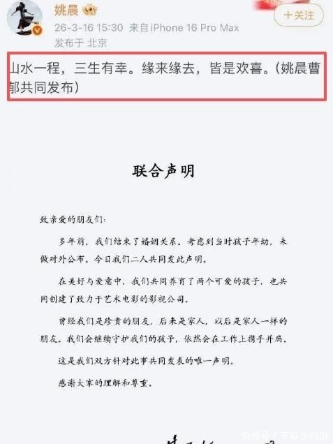 3月16日,姚晨与曹郁联合发布离婚声明,措辞沉稳克制,尽显成熟人格的分寸感。文中明确指出,二人实际已于数年前完成情感抽离,仅因子女尚处成长关键期,才选择暂缓对外公开;未来仍将恪守父母本分,协同承担育儿责任,并在职业层面持续保持良性协作关系。