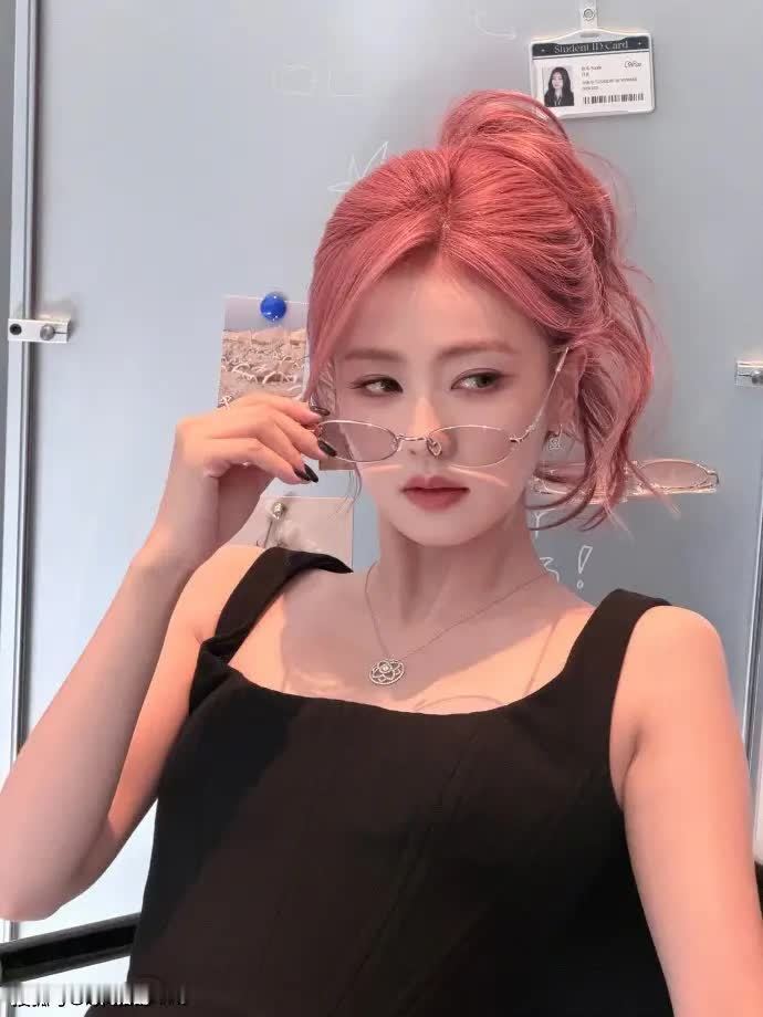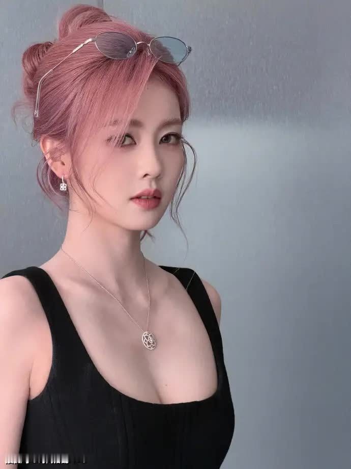 银色边框的眼镜随意地架在粉色头发上,尽显慵懒又不失书卷气息。黑色无袖上衣巧妙地勾勒出锁骨线条,银色项链上的几何坠饰与方形耳钉相互呼应。在这张图片中,白鹿以“头顶眼镜”的独特巧思打破常规,充分证明时尚感往往就蕴藏在对细节的精准把控之中。